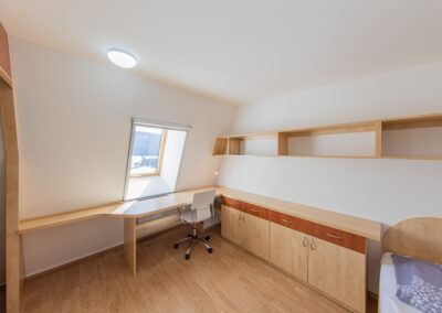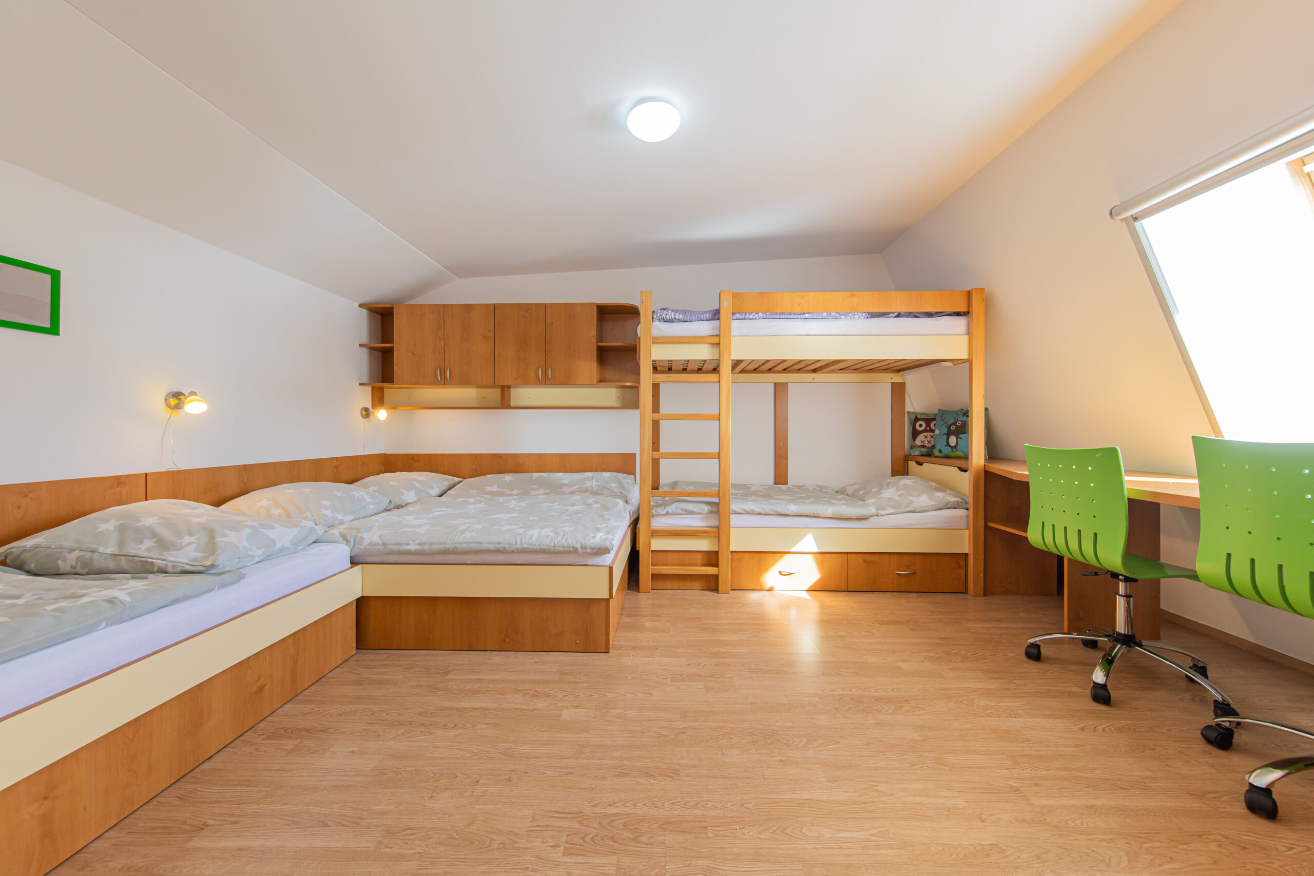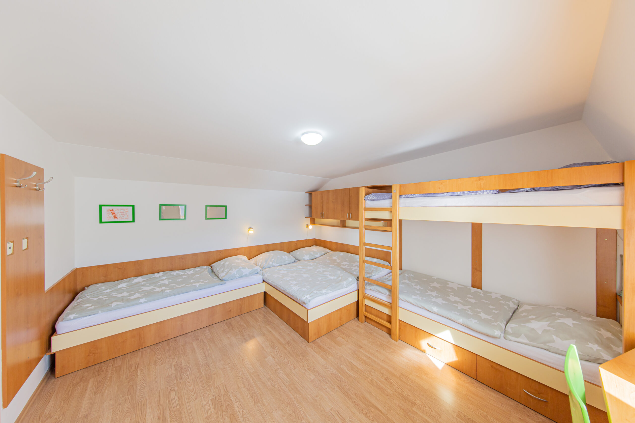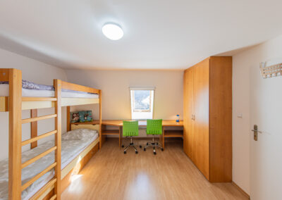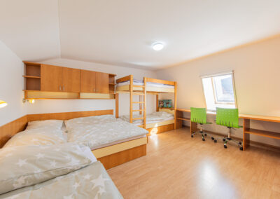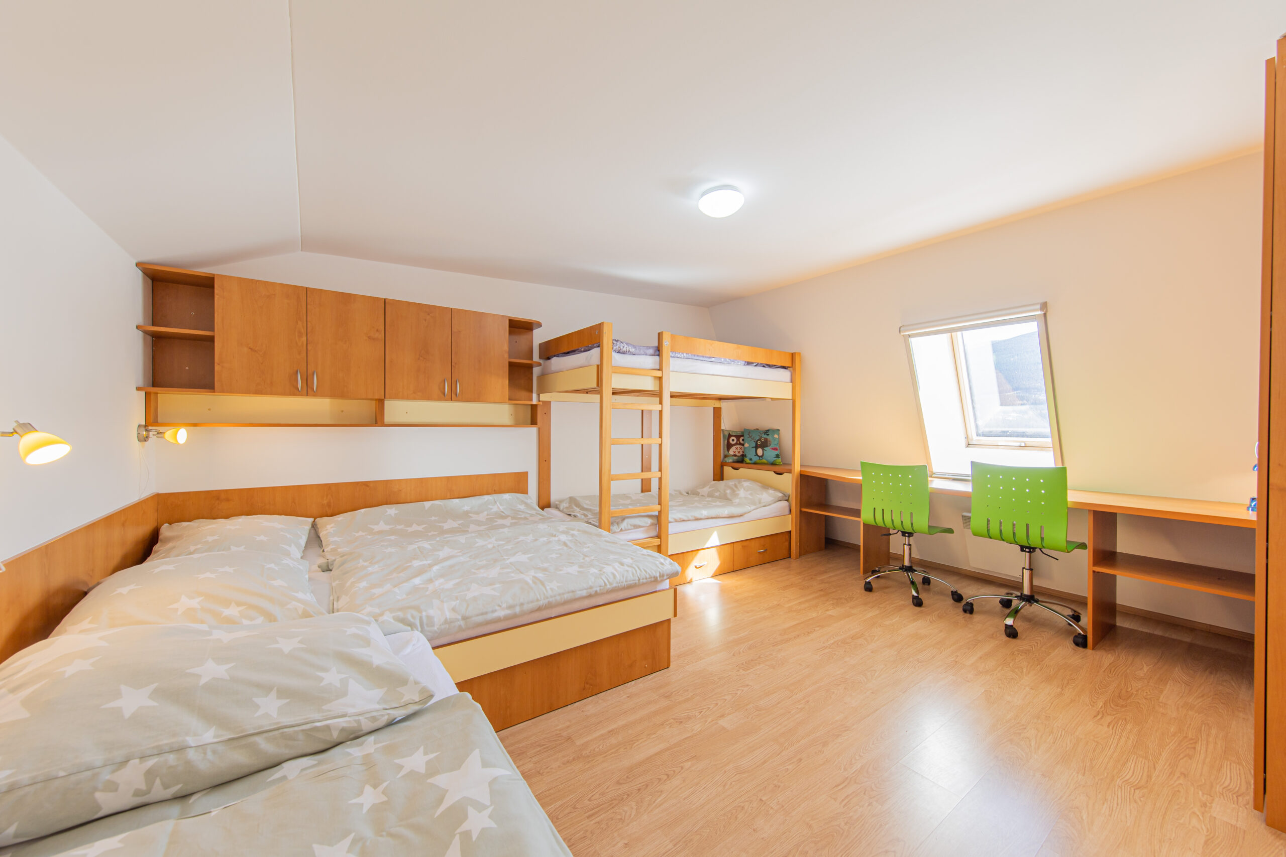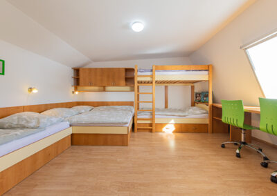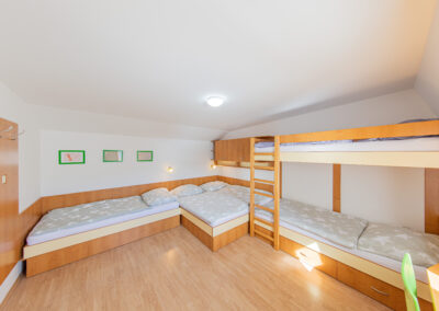 K dispozici je ve dvou horních pokojích celkem 7 lůžek, nábytek na míru, dva psací stoly, šatní skříň a vestavěná skříň. Ve společenské místnosti s kuchyňským koutem je televize Samsung o úhlopříčce 44“. Do vybavení kuchyňského koutu a obývacího prostoru patří vestavná lednice s mrazákem, mikrovlnná trouba, varná dvou-plotýnková deska, elektrická trouba, varná konvice a toustovač. V předsíni je na míru vyrobená šatní skříň s úložnými prostory. Koupelna je vybavena sprchovým koutem, umyvadlem zabudovaným v koupelnové skříni a pračkou zn. Candy. Na samostatném WC je nástěnná skříň. Vytápění celého bytového domu je na elektřinu. V apartmánu je podlahové topení a elektrické přímotopy, v koupelně elektrický žebřík.