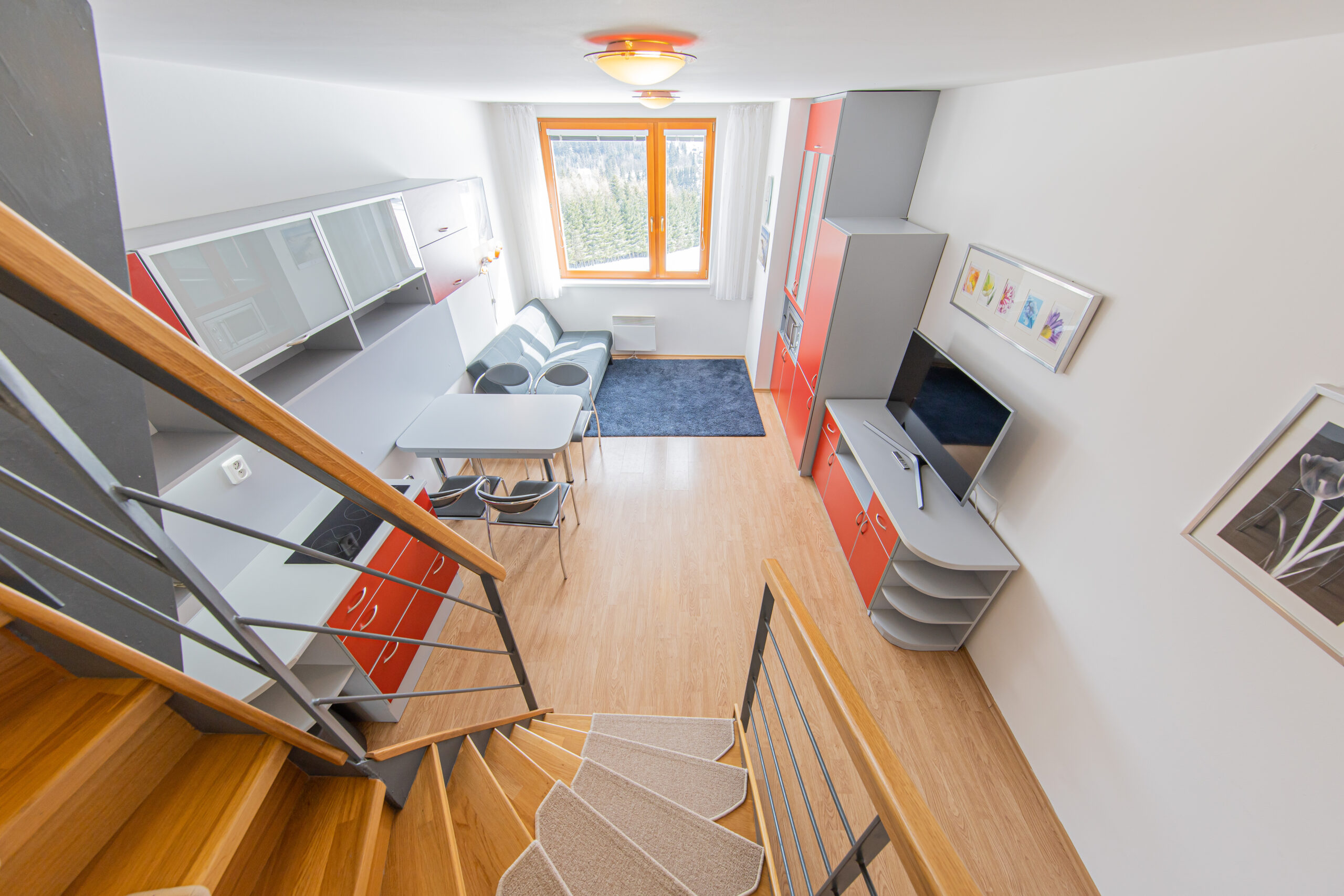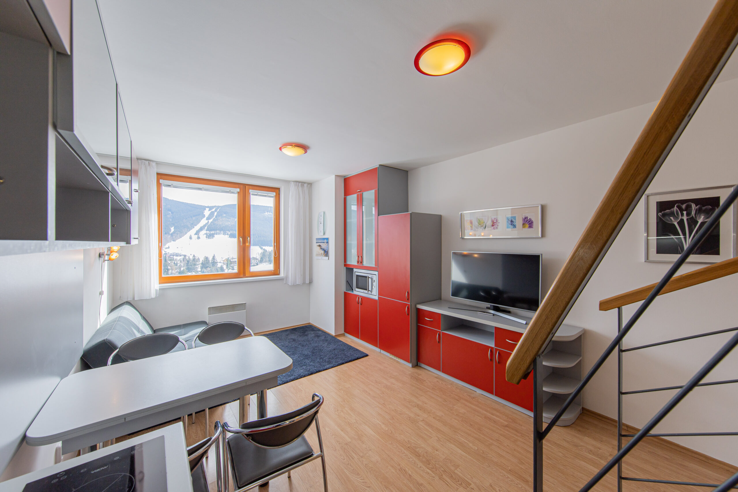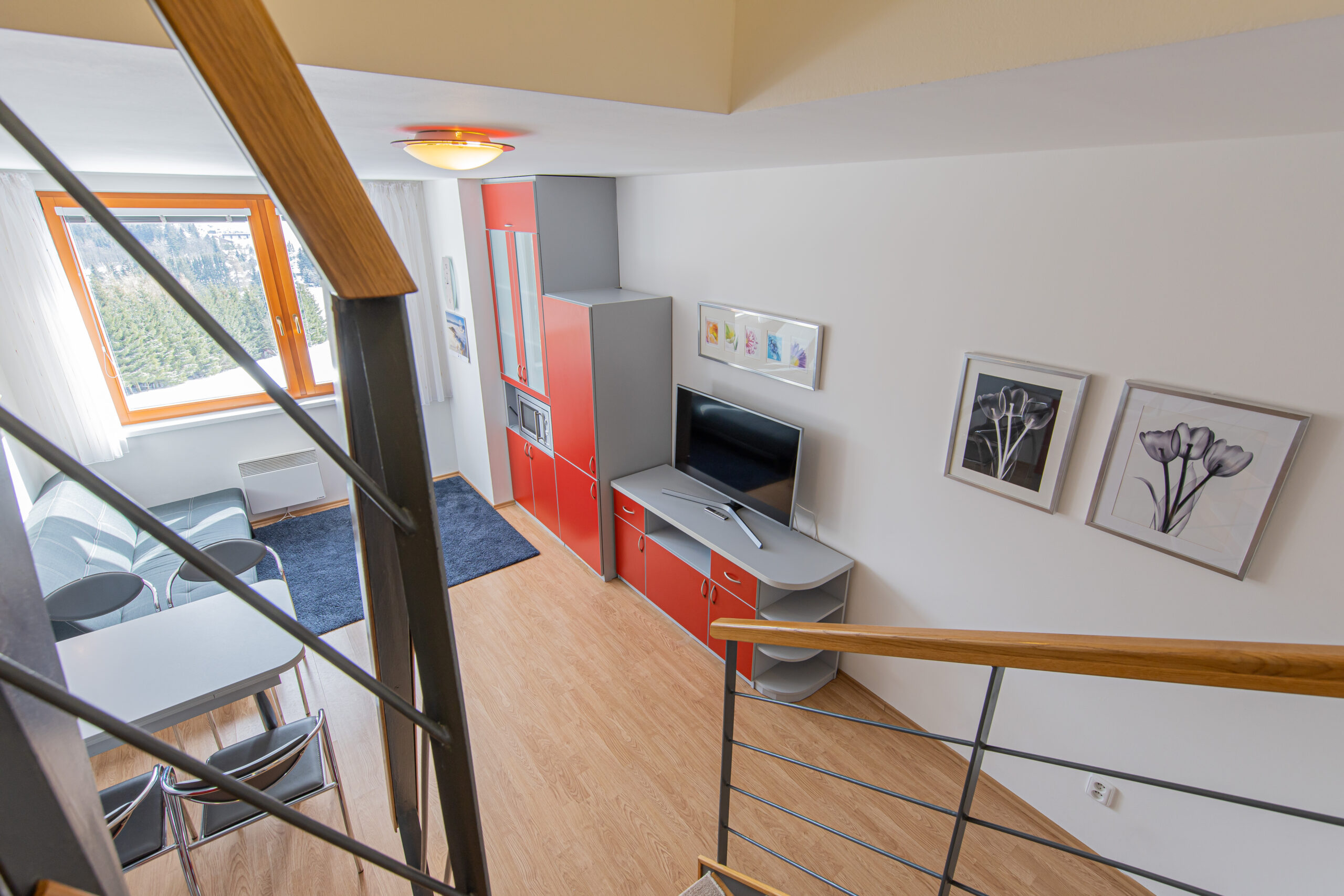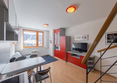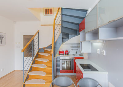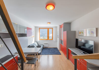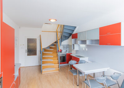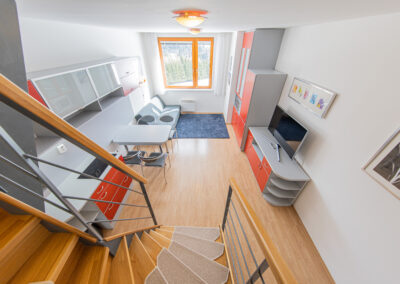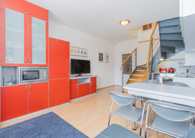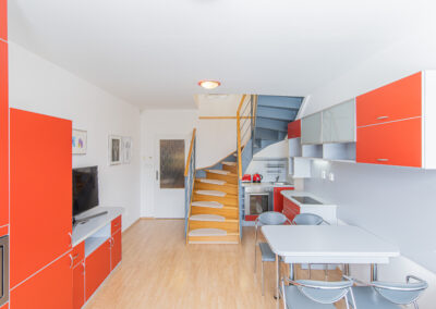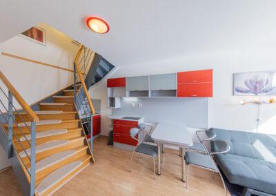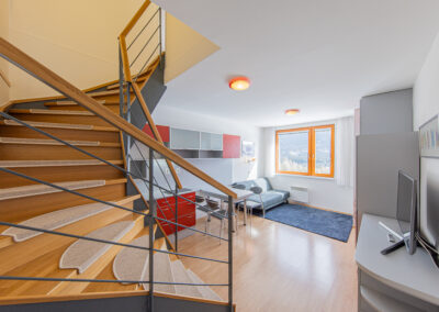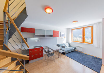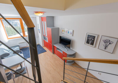 Dispozice apartmánu tvoří pokoj s kuchyňským koutem, předsíň, koupelna a WC ve 3. podlaží a dva samostatné pokoje v podkroví. Apartmán se prodává vybaven.