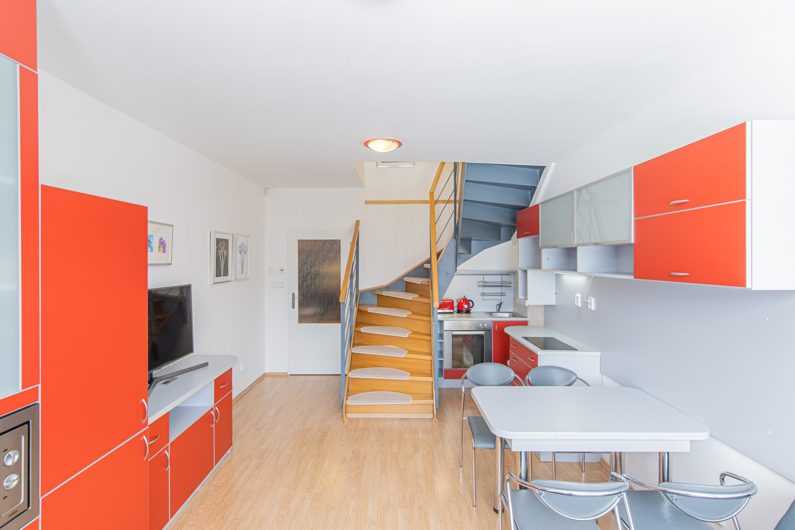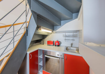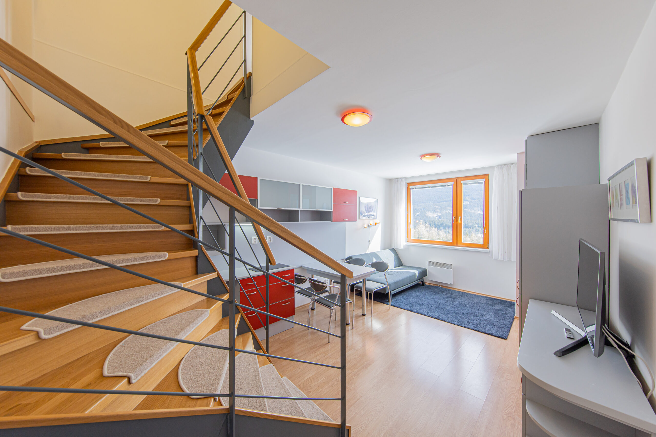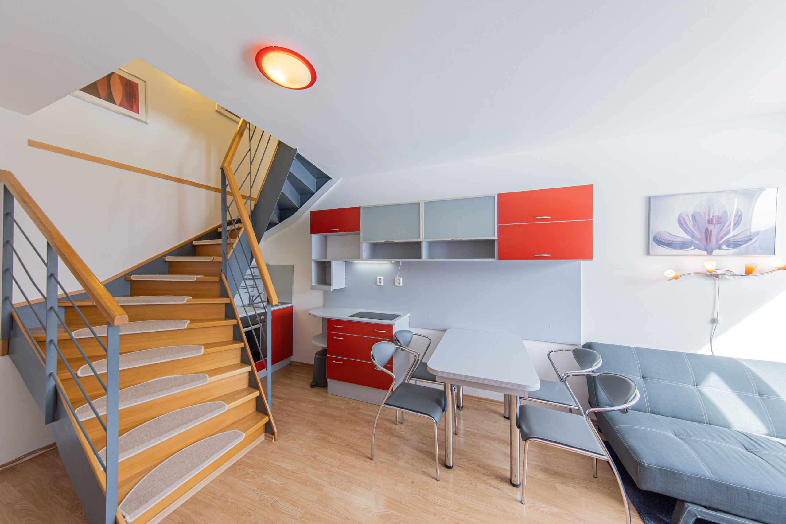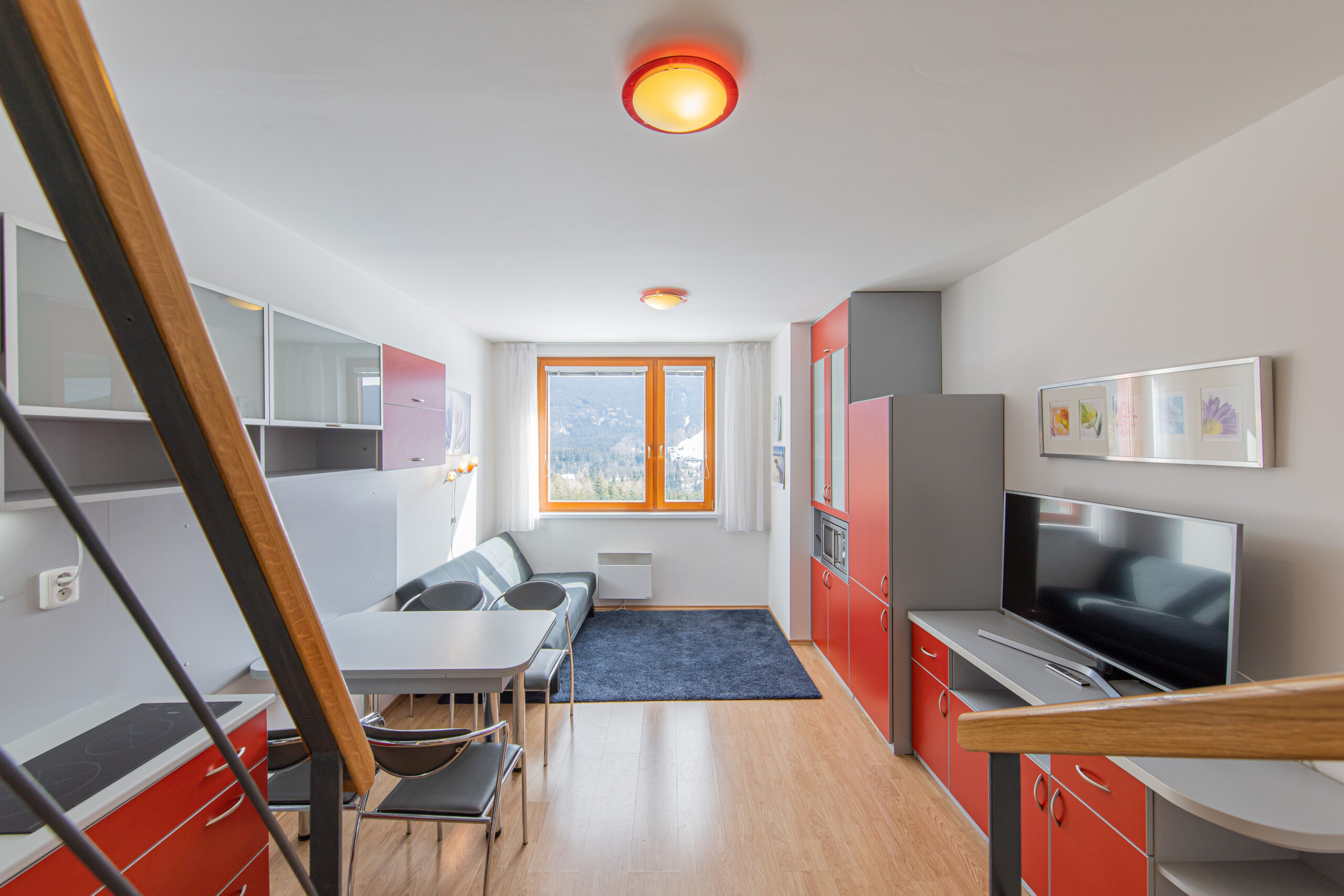 Dispozice apartmánu tvoří pokoj s kuchyňským koutem, předsíň, koupelna a WC ve 3. podlaží a dva samostatné pokoje v podkroví. Apartmán se prodává vybaven.