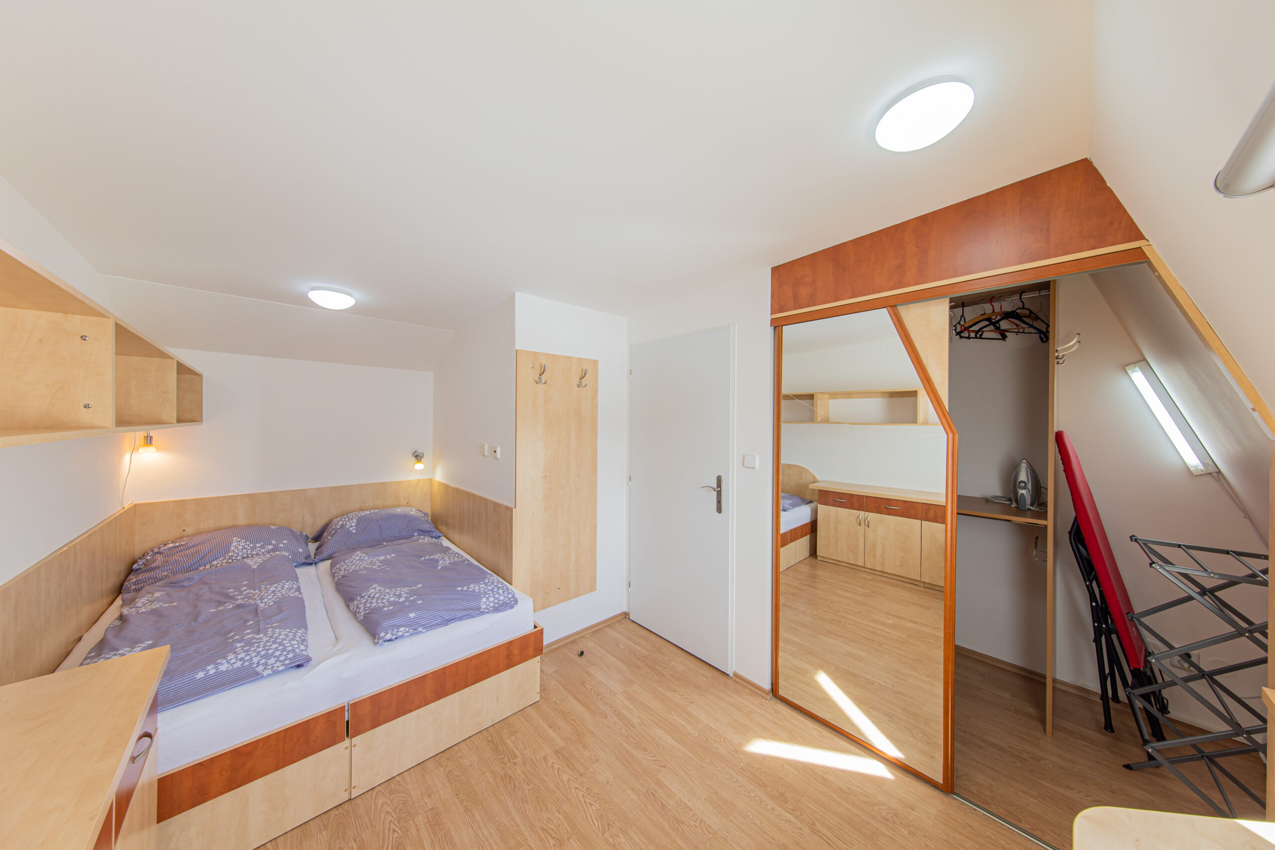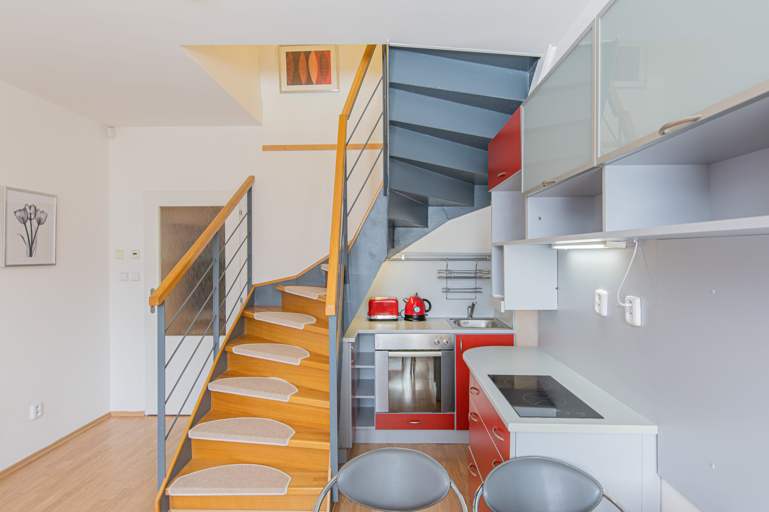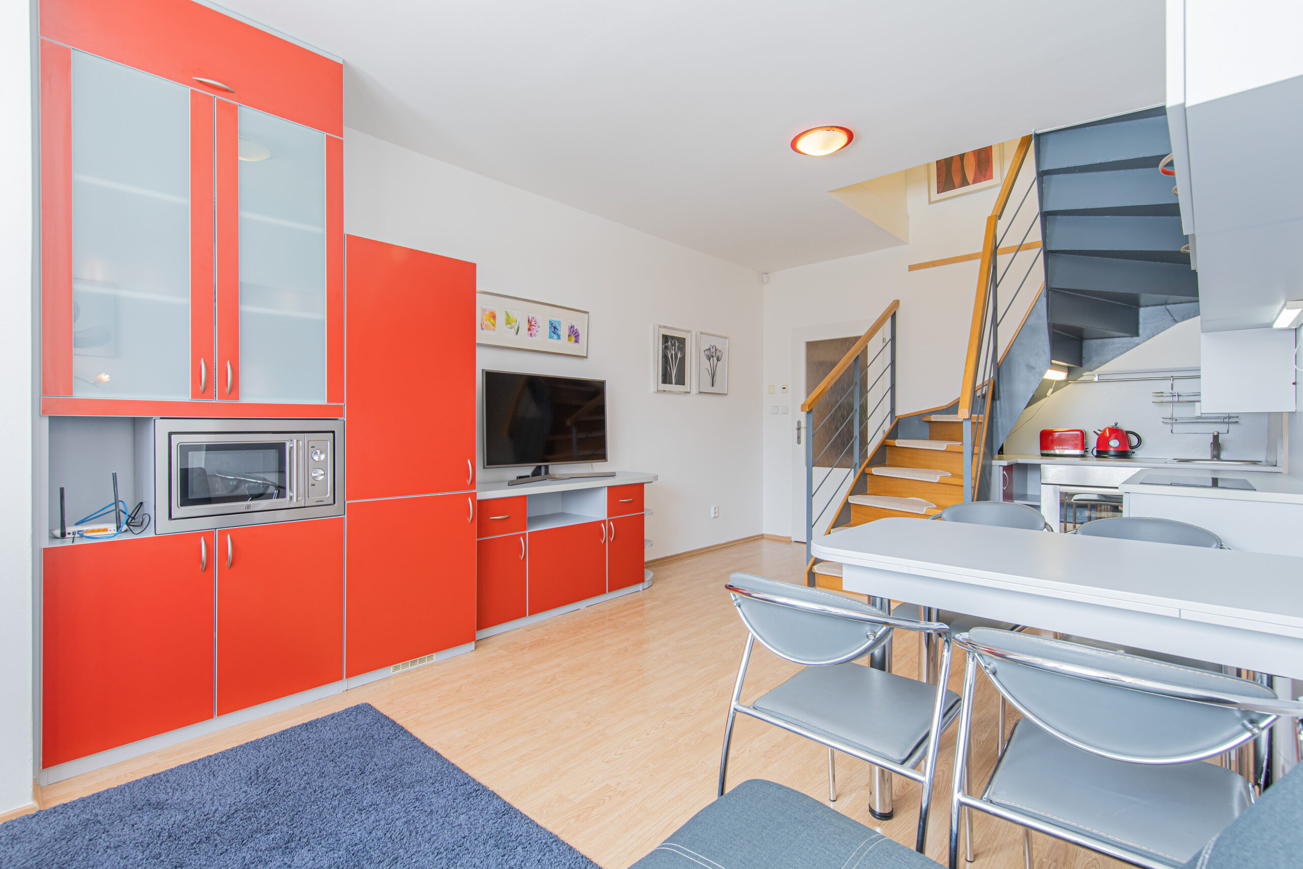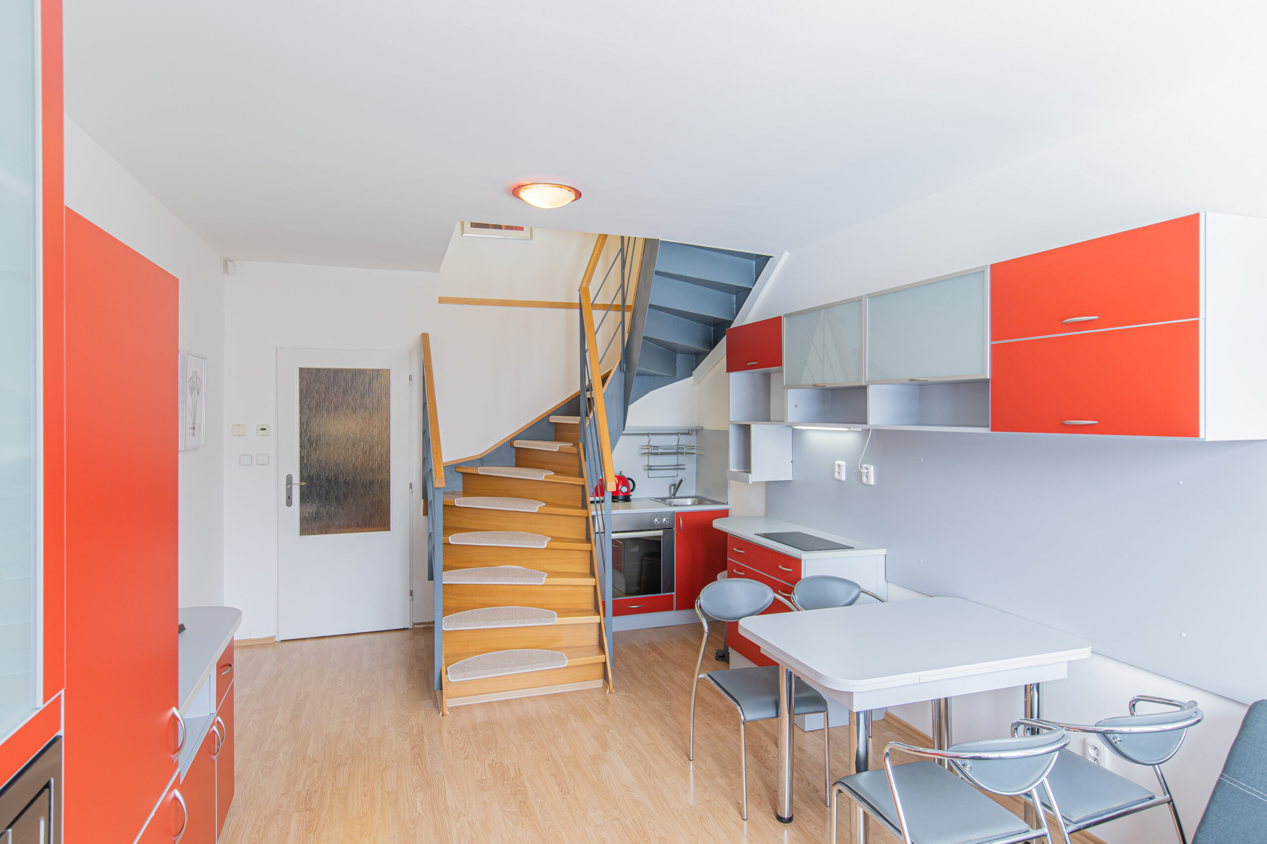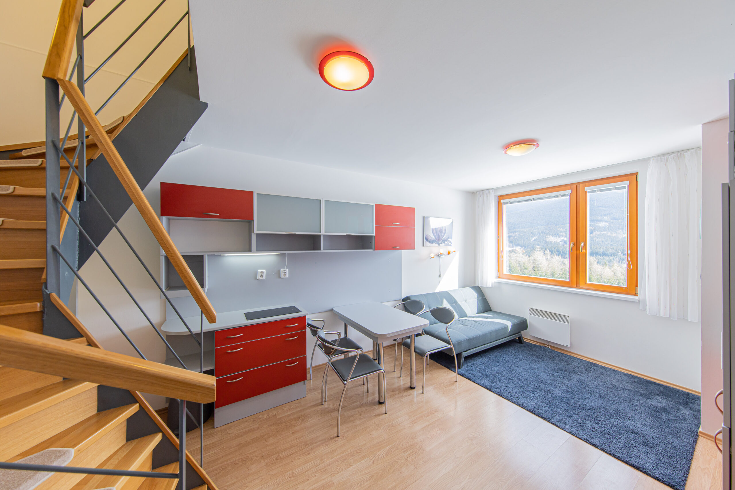 Dispozice apartmánu tvoří pokoj s kuchyňským koutem, předsíň, koupelna a WC ve 3. podlaží a dva samostatné pokoje v podkroví. Apartmán se prodává vybaven.