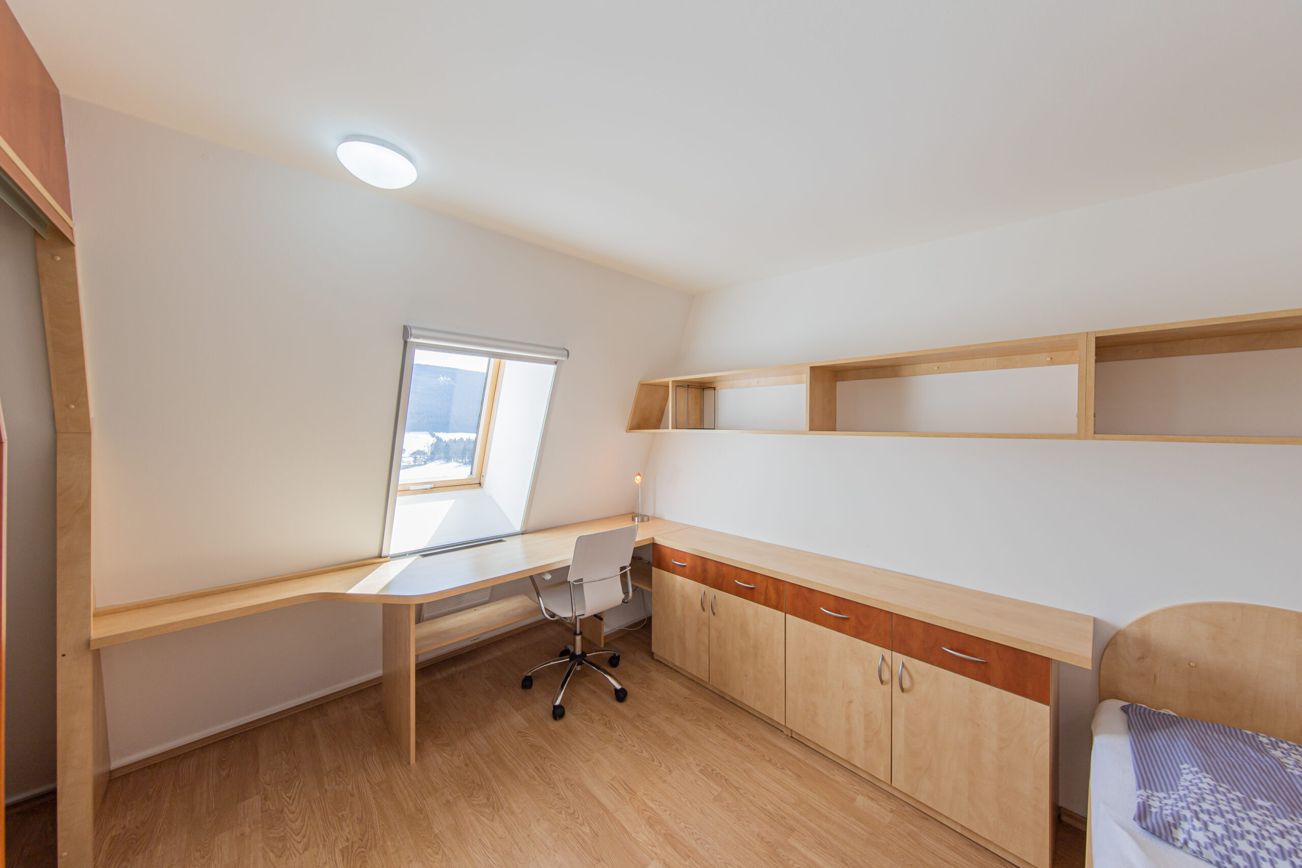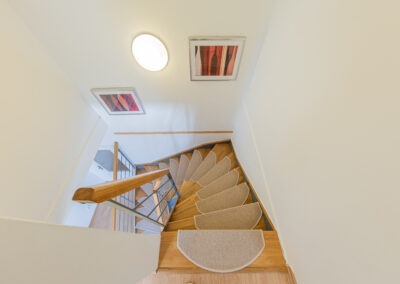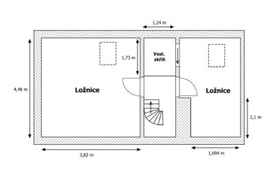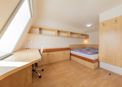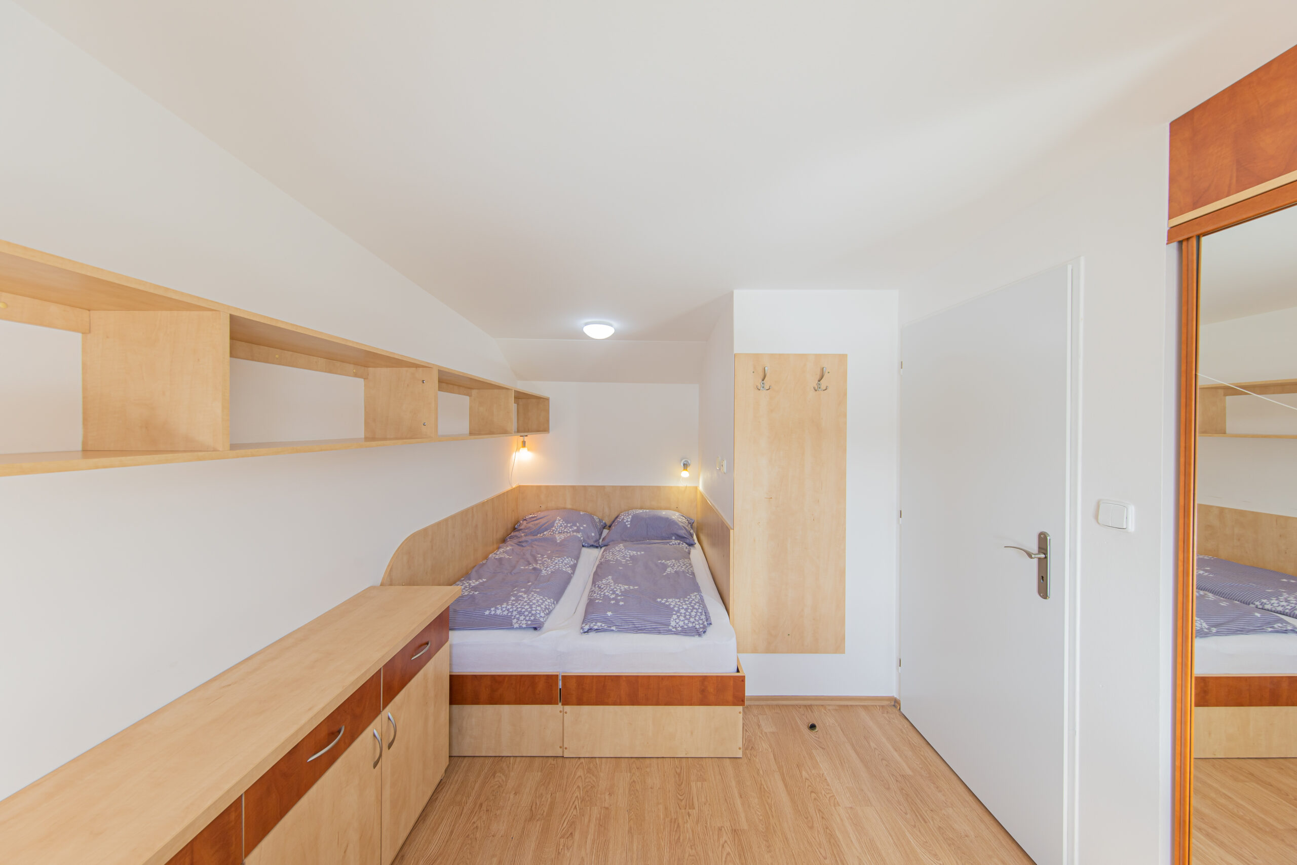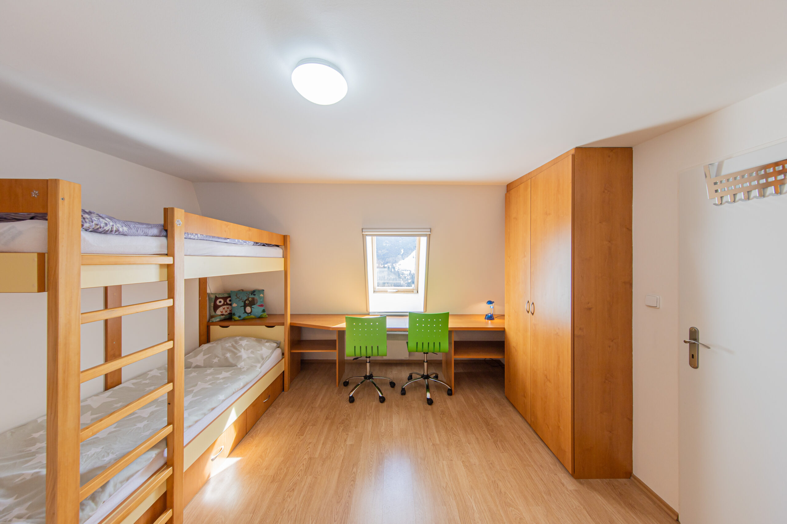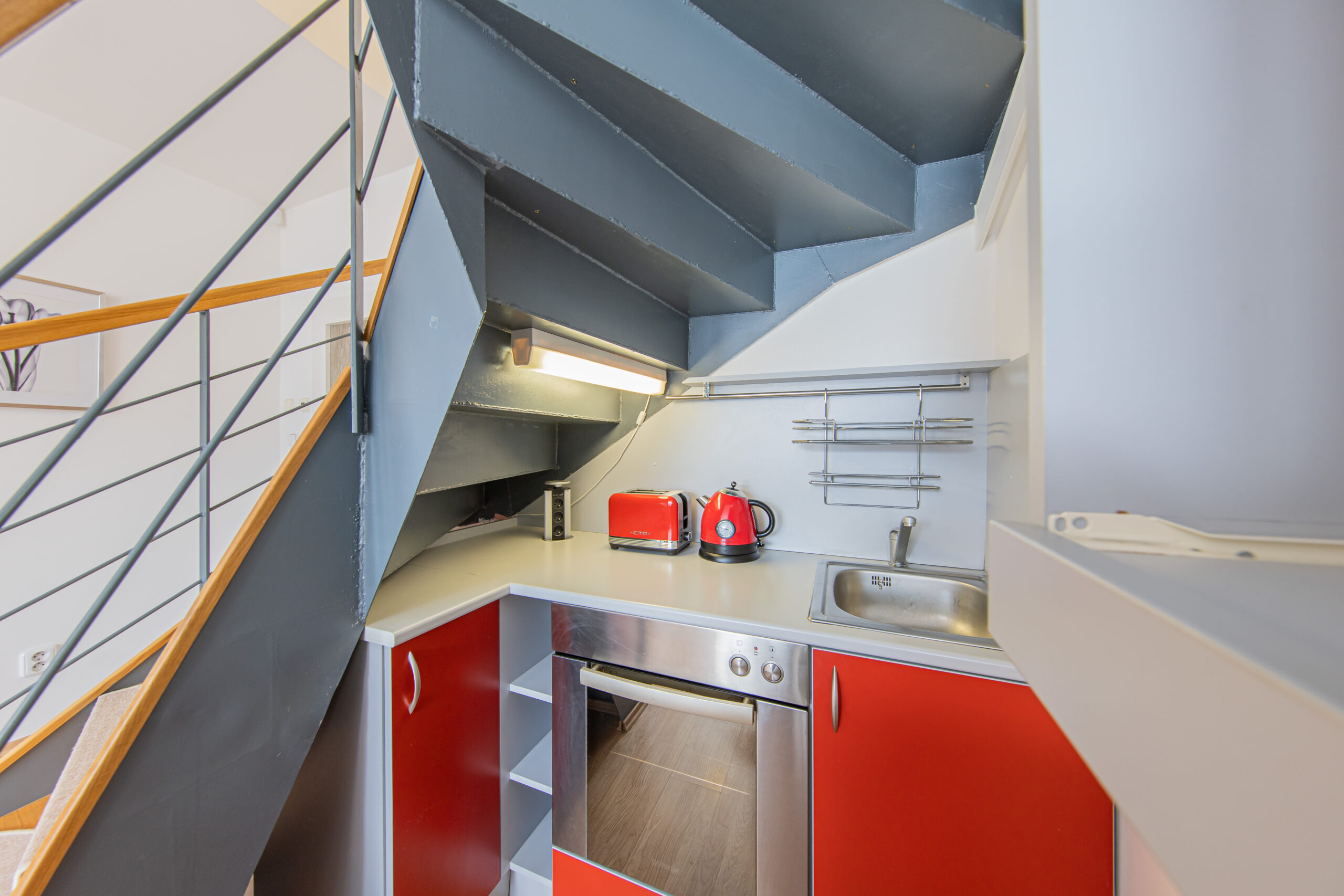 Dispozice apartmánu tvoří pokoj s kuchyňským koutem, předsíň, koupelna a WC ve 3. podlaží a dva samostatné pokoje v podkroví. Apartmán se prodává vybaven.
